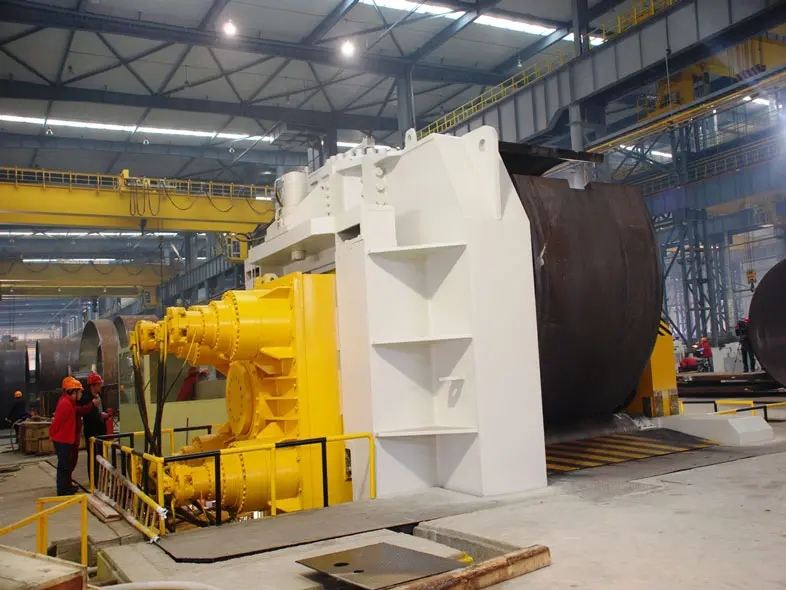 液壓全驅(qū)動(dòng)水平下調(diào)式三輥卷板機(jī),釆用右主油缸釆用上置,左主油紅下置式結(jié)構(gòu)。該機(jī)三個(gè)工作棍均為主驅(qū)動(dòng)輥,上輥由液壓馬達(dá)通過行星減速 機(jī)減速帶動(dòng)回轉(zhuǎn),下輥由液壓馬達(dá)通過行星減速機(jī)減速帶動(dòng)回轉(zhuǎn),行星驅(qū)動(dòng)裝置與卷輾軸直接耦合,可以大幅度減少負(fù)載損失(無用功),使盡可能 大的功(有用功)用于卷板;上掘的升降采用液壓傳動(dòng),升降位移由計(jì)算機(jī)控制,自動(dòng)調(diào)平,屏幕顯示,同步精度±0.2mm。下輥水平移動(dòng)采用機(jī)械 傳動(dòng),水平移動(dòng)通過蝸輪減速機(jī)減速,經(jīng)螺桿、螺母副轉(zhuǎn)換為直線運(yùn)動(dòng)帶動(dòng)。翻倒架的傾倒和復(fù)位采用液壓傳動(dòng)上的尾部裝有液壓平衡機(jī)構(gòu),可以方便卸出卷制后的工件及筒體。設(shè)有固定式操作臺(tái)和遙控按鈕盒各一個(gè),方便工人使用。設(shè)有安全聯(lián)鎖裝置,使操作更加安全。該機(jī)操作簡(jiǎn)單、維 修方便,卷制精度高,是一種先進(jìn)實(shí)用的大型卷板設(shè)備。